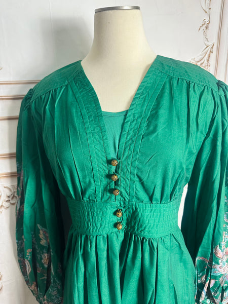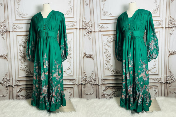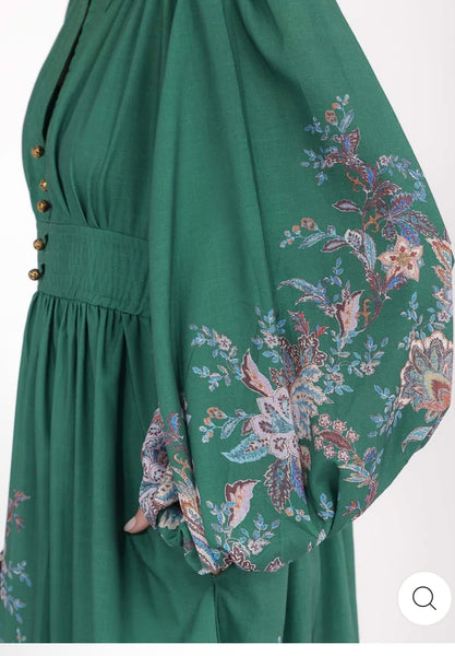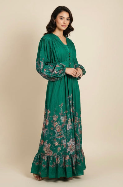 A cotton maxi dress featuring a plunging V-neckline, with elasticated cuff and gathered waist.