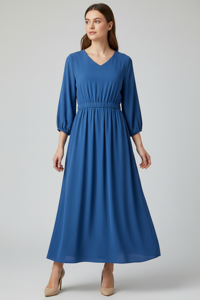 This elegant V-neck maxi dress with 3/4 sleeves. Crafted with an elastic waistband and front pockets. Its flowing silhouette and light weight fabric.